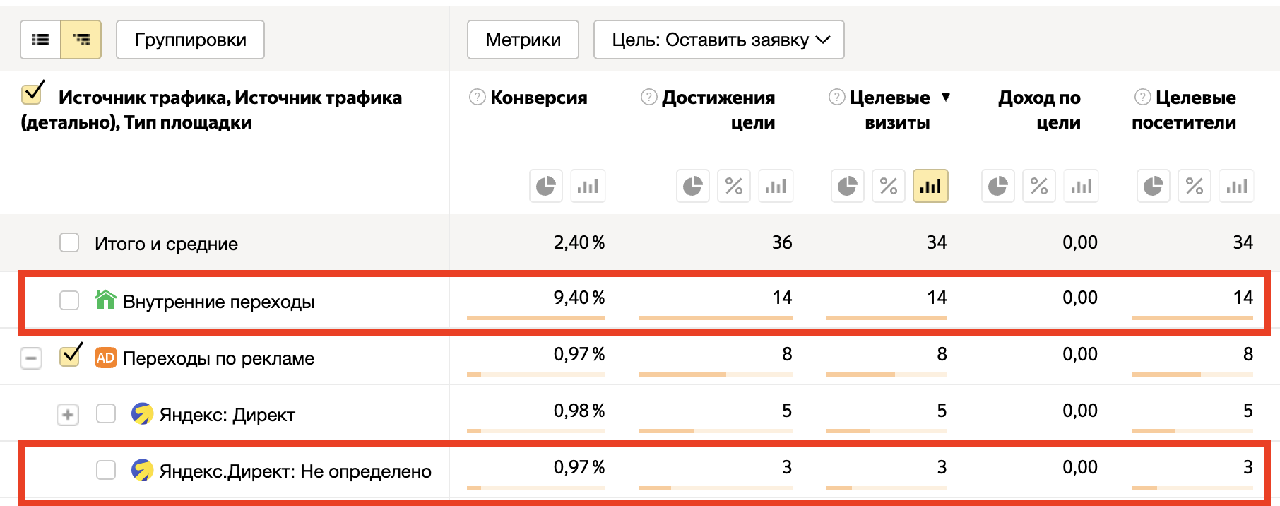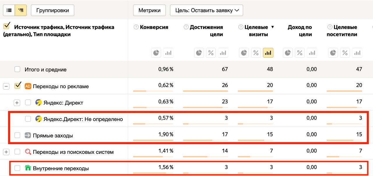 Понять, что проблема уже здесь, можно по очень характерным симптомам. Самый частый сценарий — сайт только что опубликован, он еще не успел нормально проиндексироваться. Далее вы запускаете Яндекс Директ, а в отчетах внезапно появляется аномально много конверсий из любых источников, кроме Директа: органика, прямые, рефералы и пр. На конструкторах это встречается особенно часто: там SEO почти всегда настроено либо базово, либо криво, поэтому обращайте внимание: