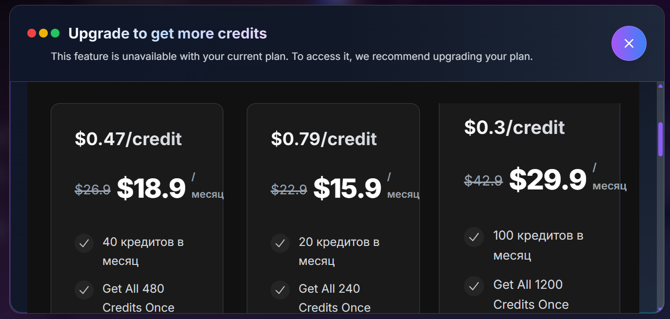 Доступность: после регистрации через почту. Есть бесплатная версия, где пользователю дается 80 кредитов (внутренняя валюта) в месяц.