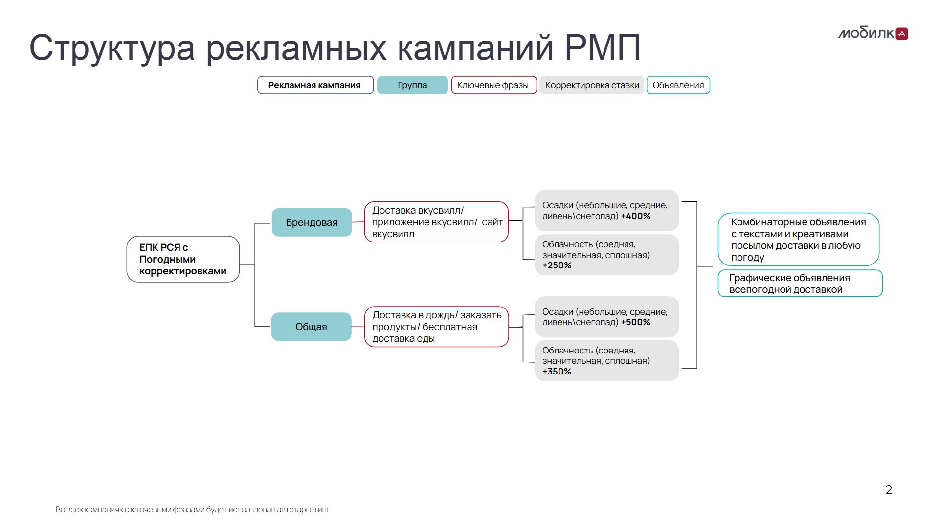 До появления Единой перфоманс-кампании мы совместно с командой «ВкусВилла» долго работали с РСЯ через Мастер кампаний — в разное время и с разным подходом. Пробовали всё, что было доступно: