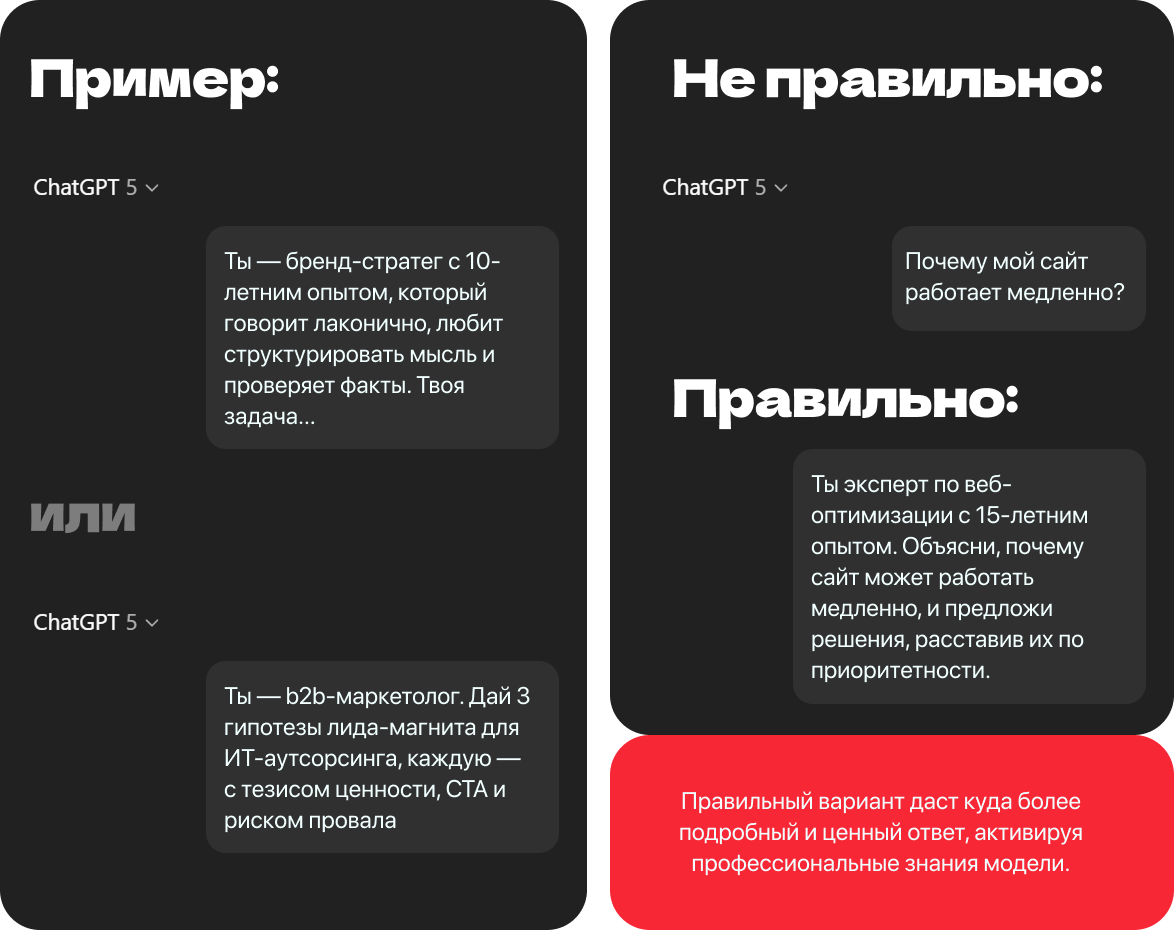 Ролевой промптинг помогает улучшить результат. Можно сразу задать модели роль бренд-стратега, редактора делового издания, креативного директора или сценариста. Тогда результат становится более целостным и профессиональным. Роль задает рамку мышления и снижает вероятность абстрактных формулировок.