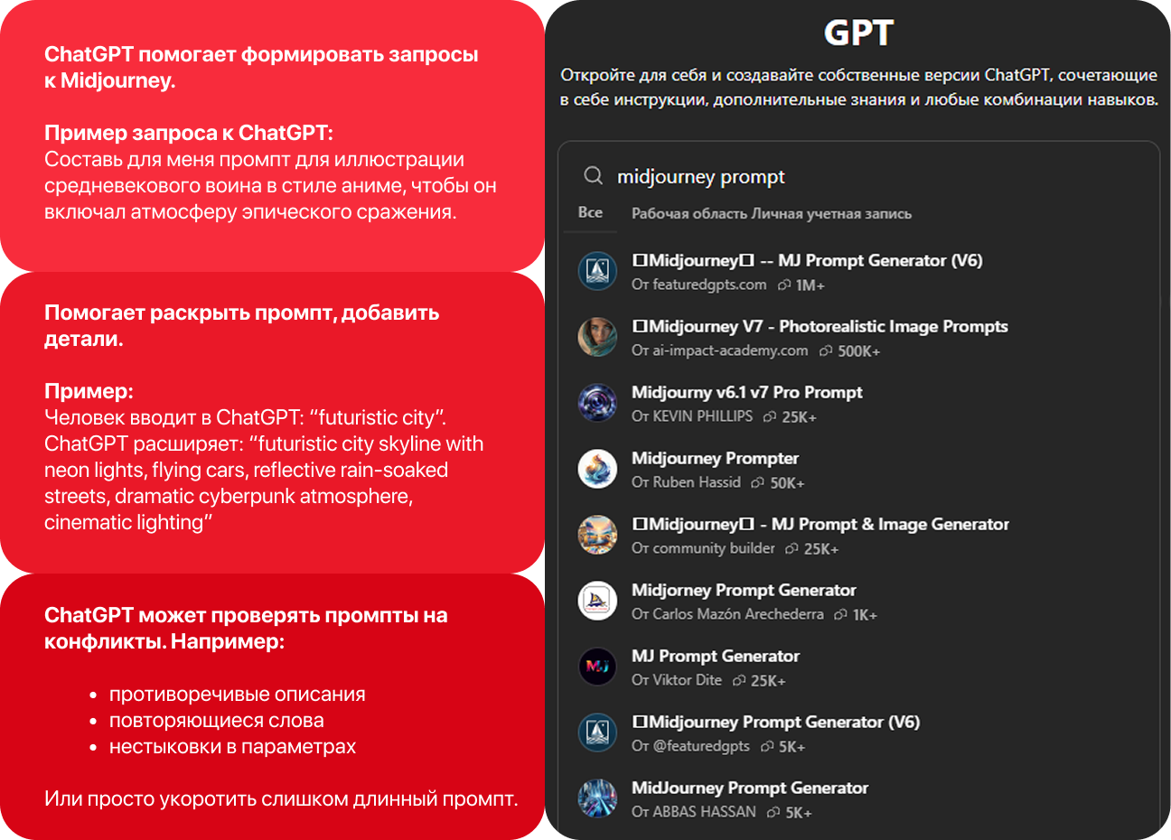 Языковая модель может заметно ускорить и упростить процесс промптинга. Она помогает генерировать идеи, выстраивать структуру промпта, улучшать формулировки и т. д. Рассмотрим на примере связки Midjourney и ChatGPT.