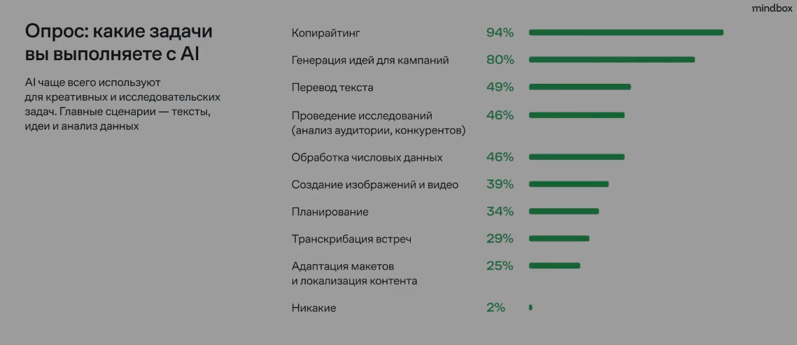 генерация креативов: текстов, картинок, видео, причем это работает хорошо, но в автоматизацию не отдается;