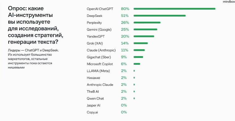 Согласно опросу Mindbox, самые популярные ИИ — OpenAI ChatGPT, DeepSeek, Perplexity.