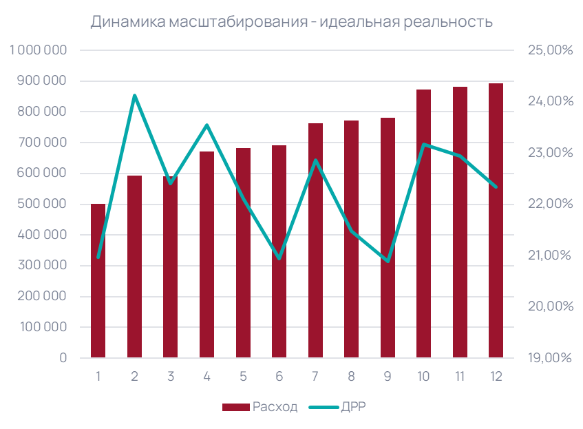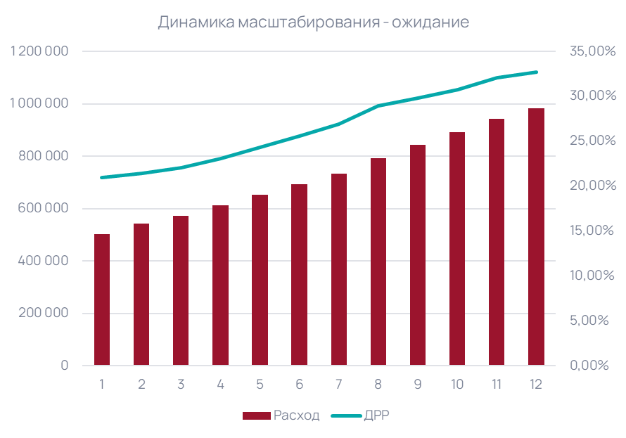 Модели роста. В процессе работы с рекламными кампаниями мы часто сталкиваемся с мнением специалистов, что при росте бюджетов будут расти и показатели по ДРР, а это будет ухудшать окупаемость. Однако, как показывает практика, многие рекламные кампании работают по стратегиям с оплатой за конверсии. На эффективность влияет то, как обучаются стратегии в зависимости от объема данных по целям. В результате мы получаем абсолютно другой тренд показателей эффективности.