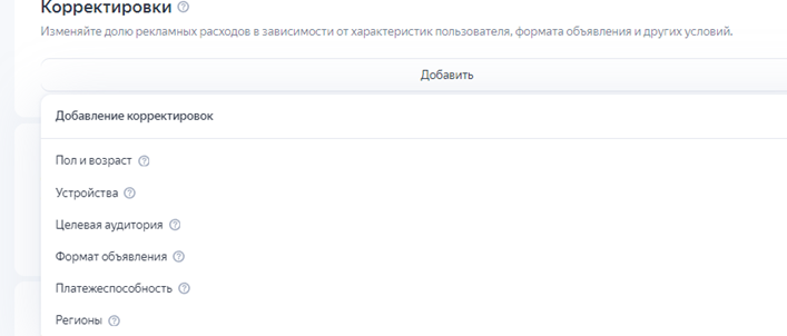 корректировки стоимости привлечения на группу по CPA, ДРР, CPC от настроек стратегии кампании;