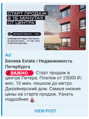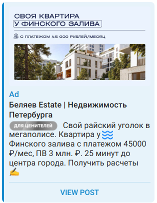 Далее мы предложили в качестве привлечения баннеры в Telegram Ads. При этом важно, чтобы обращение было не только низким по стоимости, но и доходило до сделки с адекватным чеком. Поэтому особое внимание нужно уделять выбору рекламируемых объектов.