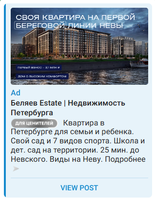 Средний CPM в тематике недвижимости и инвестиций в Telegram Ads составляет около €9 при таргетинге на каналы. В формате посевов — от 2500 рублей. В нашей кампании CPM оказался значительно ниже — 310 рублей по курсу 95 рублей за €1 с учетом комиссии 20% и НДС.