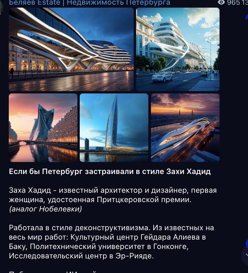 Внедрили креатив стабильно один раз в неделю — публикации с целью сохранений или репостов. Например, архитектурные достопримечательности Петербурга в стиле Захи Хадид, сгенерированные нами с помощью нейросетей.