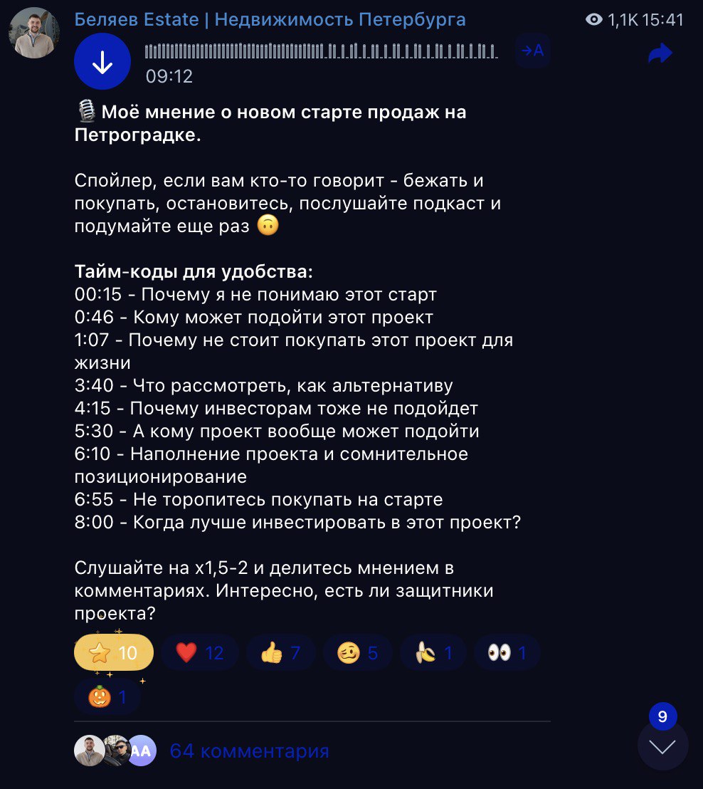 экспертный живой контент (голосовые подкасты и «кружки» про объекты недвижимости, которые берем в рекламу);