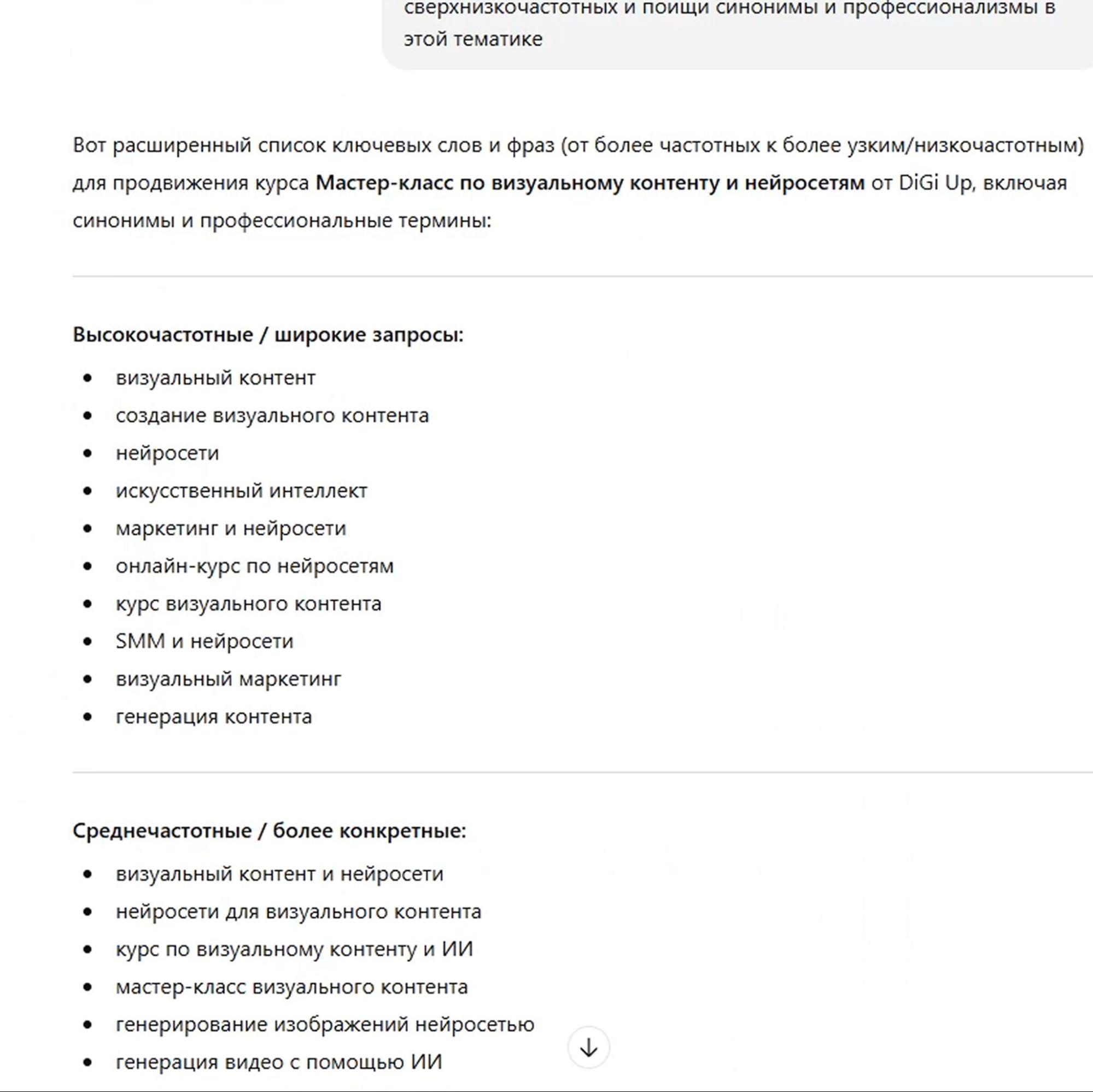 Совет: для фильтрации запросов пишите отдельный промпт к каждому пункту. Так ИИ даст вам наиболее релевантный ответ.