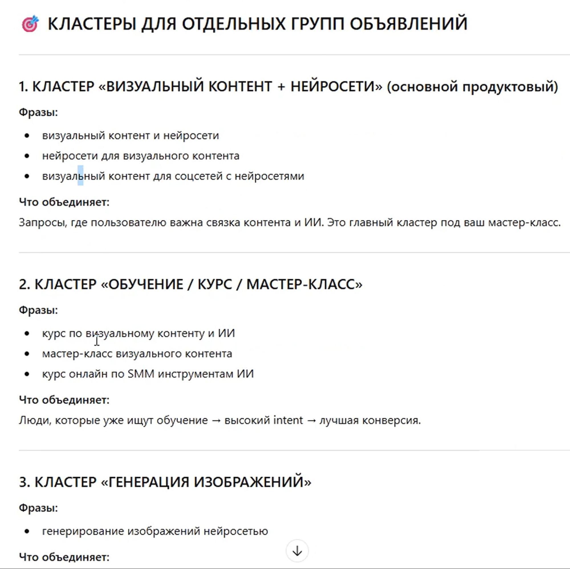 Просим ИИ разбить запросы на кластеры отдельных групп объявлений. Пример промпта для кластеризации:
