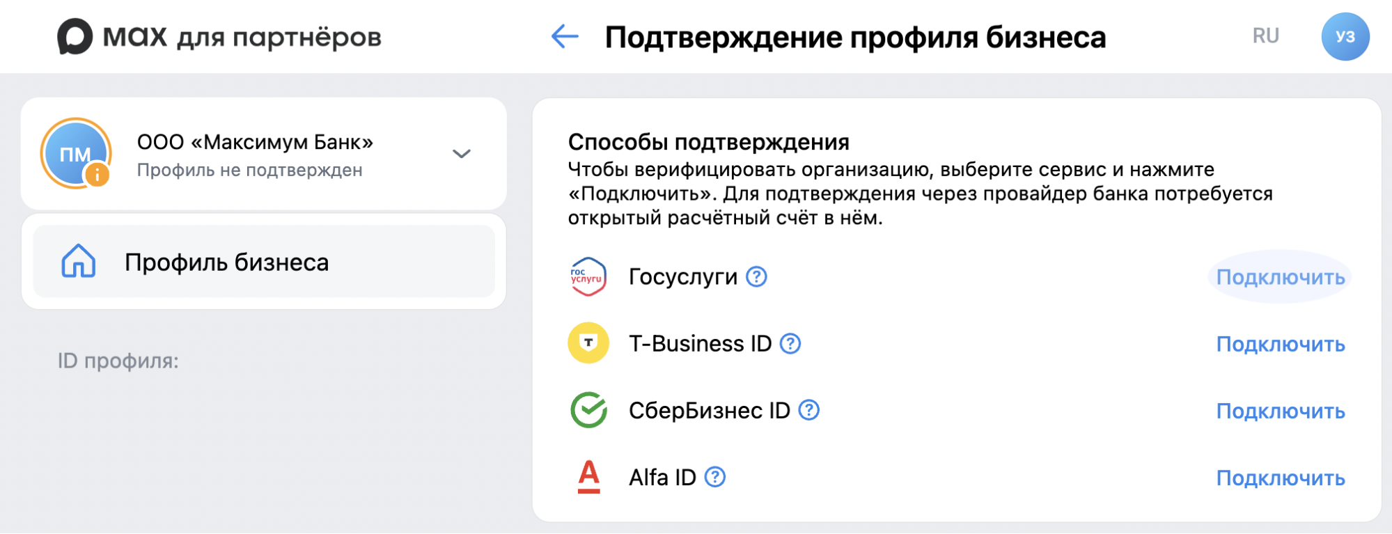 Выберите способ подтверждения: через Госуслуги или через банковские сервисы Alfa ID, Т-Business ID, СберБизнес ID. Чтобы пройти верификацию через банковский сервис, необходимо иметь расчетный счет в конкретном банке, владельцем которого вы являетесь.
