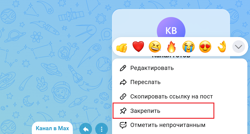 Закрепленный пост всегда находится вверху канала. Разместите в нем важную информацию: правила, навигацию, контакты. Его цель — познакомить новых подписчиков с вами.