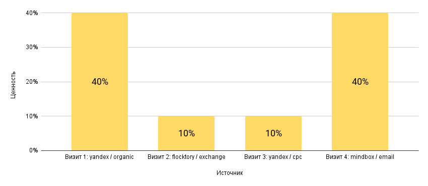 Эта модель ближе к реальности, чем, например, «Последний клик». Она показывает, что путь к покупке — это не один момент, а цепочка касаний, где важны и начало, и конец.