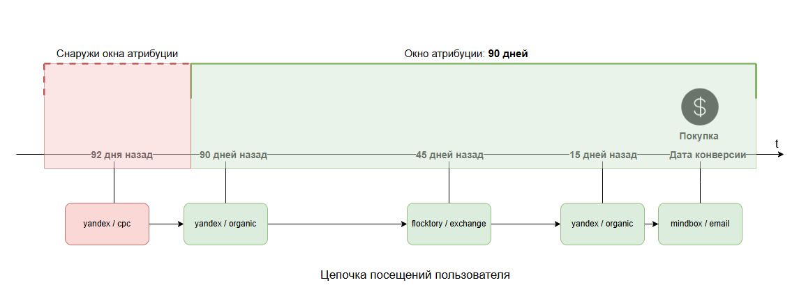 В Яндекс Метрике по умолчанию применяется окно атрибуции — это период, в течение которого визиты одного пользователя считаются частью одной истории взаимодействия с сайтом. Например, если человек не заходил на сайт больше 90 дней, его предыдущие визиты перестают учитываться, и при следующем заходе начинается новая история.