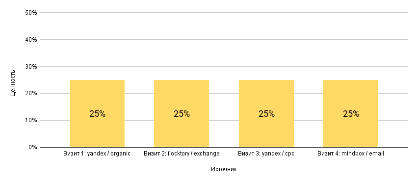 Чтобы рассчитать такую модель, нужно определить, через какие каналы человек заходил на сайт (включая визит, во время которого он совершил целевое действие), а затем поровну распределить значимость между этими источниками. Расчет модели доступен по ссылке.