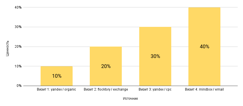 Эта модель строится на простой логике: чем ближе визит к покупке, тем он важнее. Первое касание считается наименее значимым, а последнее — наоборот, самым ценным.