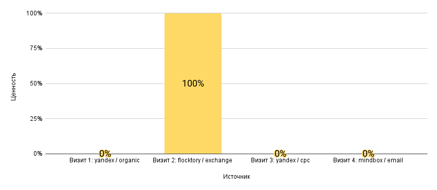 если у пользователя был всего один визит, то 100% ценности отдается источнику, с которого начался этот визит;