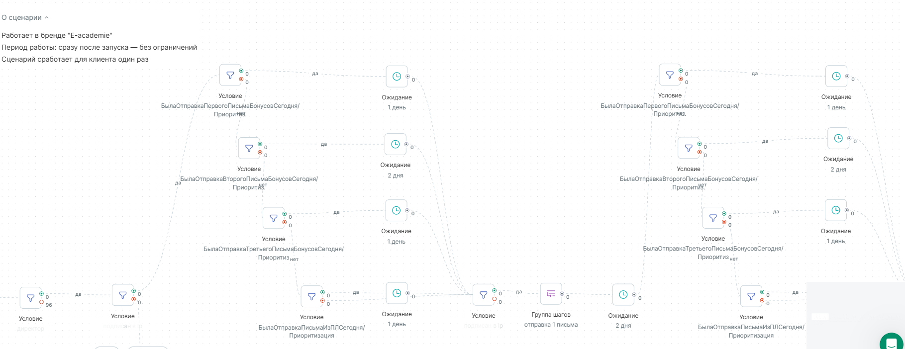 В процессе клиент решил изменить логику трех приоритетных цепочек (по начислению бонусов новым клиентам), поэтому часть условий пришлось пересобрать. Но на фоне всего объема работы это уже показалось технической мелочью.