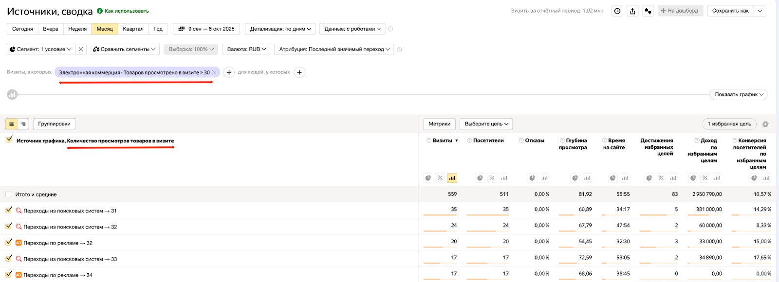 Где смотреть: любой отчет, например, «Источники, сводка», где можно добавить сегментирование «Электронная коммерция → Товаров просмотрено в визите > 30». Также можно вывести конкретные значения в таблицу «Электронная коммерция → Количество просмотров товаров в визите».
