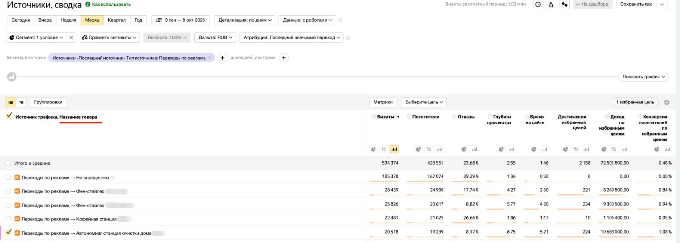 Где смотреть: любой отчет, например, «Источники, сводка», где можно добавить в таблицу группировку «Название товара».