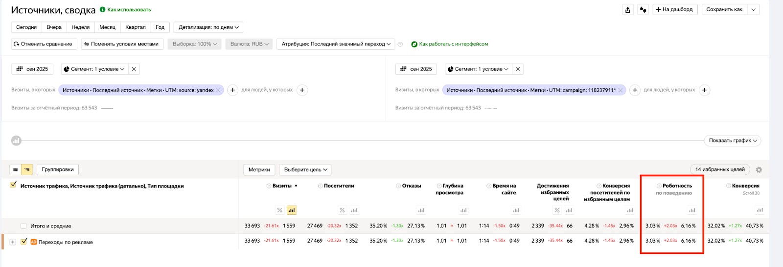 Высокая роботность именно у одного источника при нормальных значениях по остальному трафику.