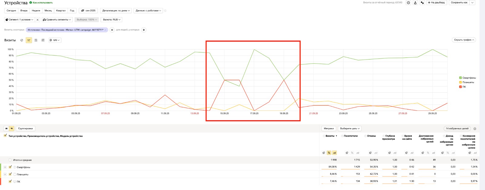 Фродовый трафик часто имеет перекос по типу устройств. Это связано с тем, что боты работают либо с серверов (эмуляция ПК), либо с мобильных ферм с однотипными настройками. Посмотреть это можно в отчете «Технологии» → «Устройства».