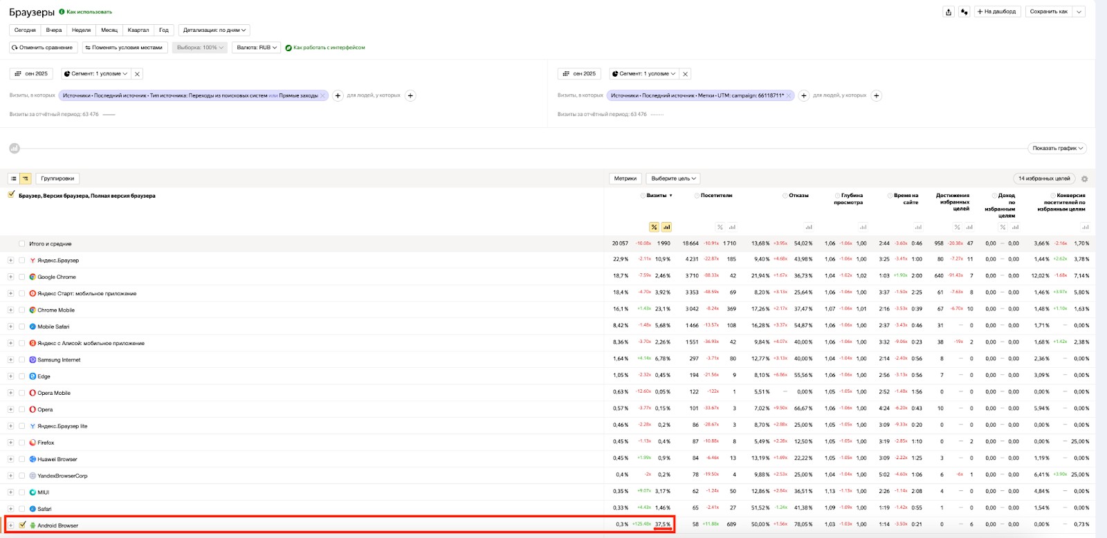 На анализ браузеров тоже нужно обратить внимание. Как и с «устройствами» он может подсвечивать низкоуровневых ботов, у которых не заданы характеристики или заданы с одними устройствами на всех.