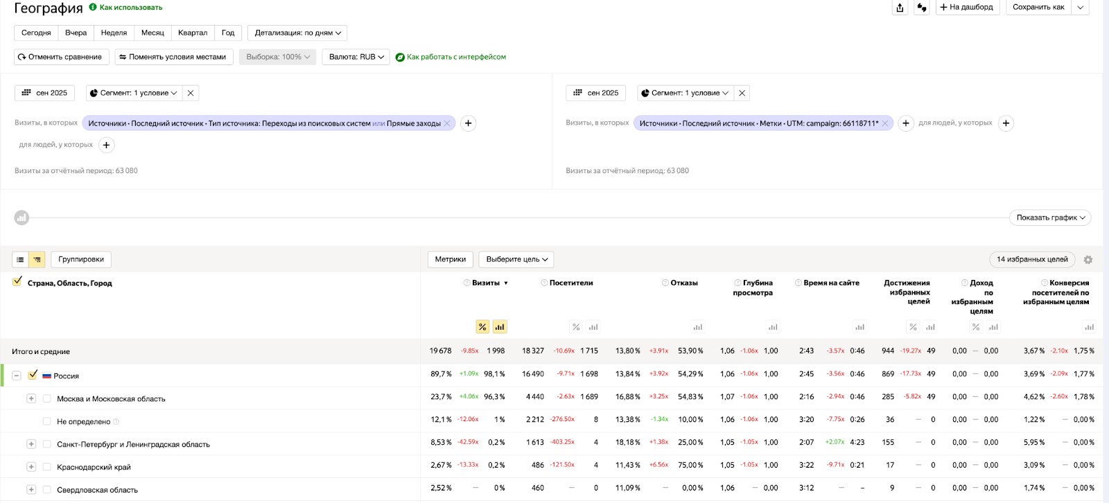 значительная доля визитов из регионов, которые не указаны в настройках рекламной кампании;