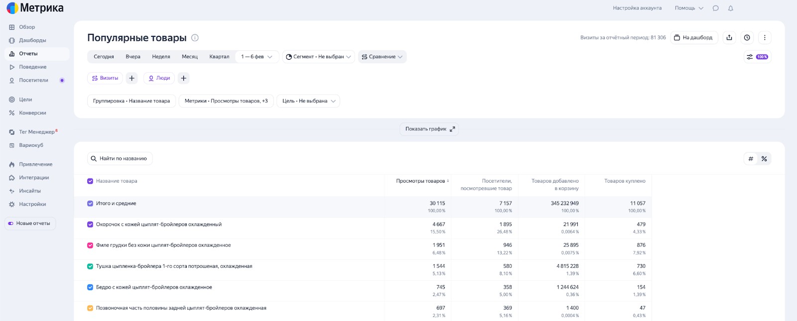 Где смотреть: отчет «Электронная коммерция» → «Популярные товары». Сравниваем с информацией от клиента по товарам.