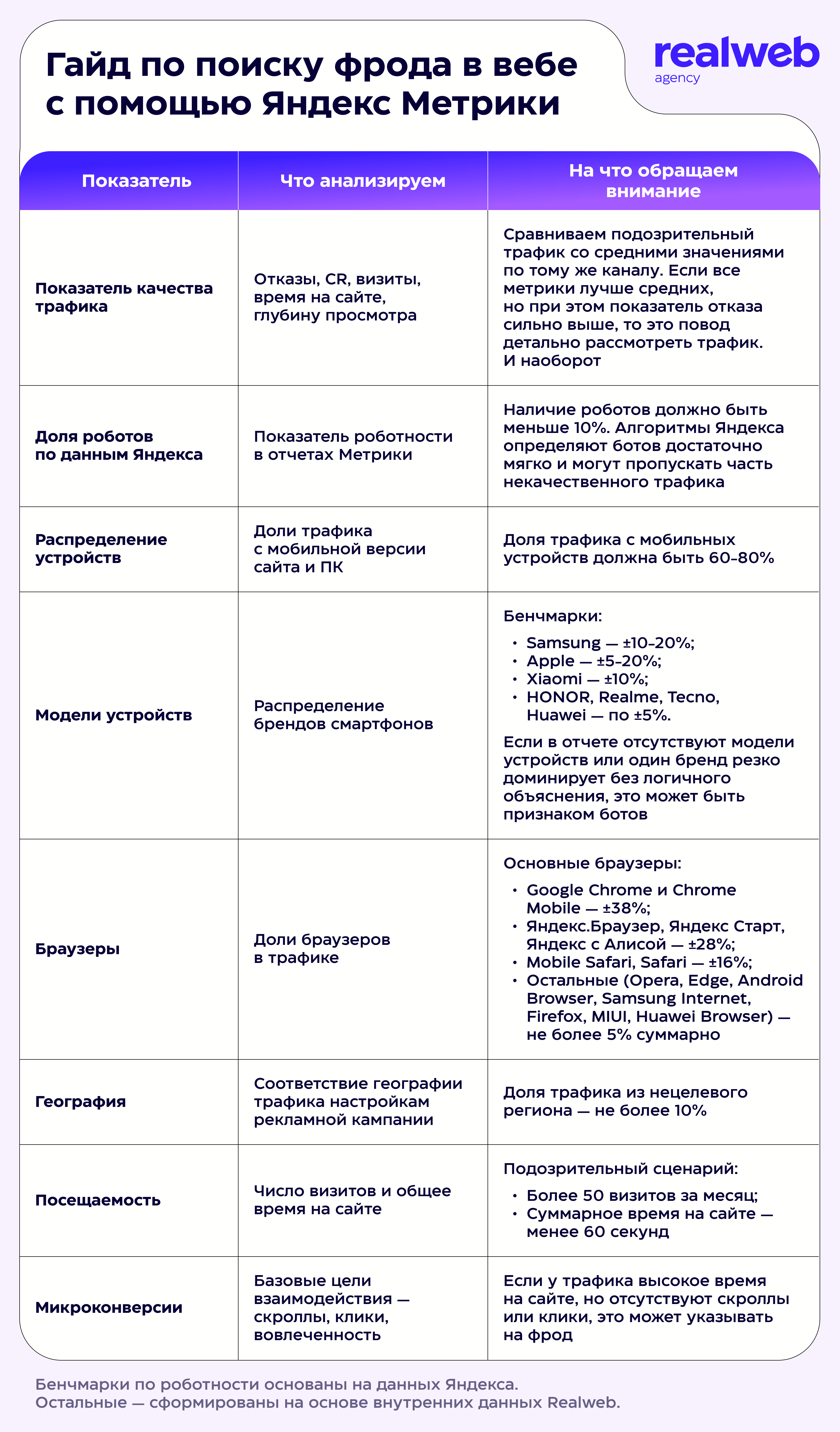 Ниже — пошаговый алгоритм ручной проверки трафика в Метрике. Бенчмарки приведены для понимания общей картины и могут отличаться в зависимости от тематики сайта, источника трафика и региона. Бенчмарки по роботности основаны на данных Яндекса. Остальные — сформированы на основе внутренних данных Realweb.