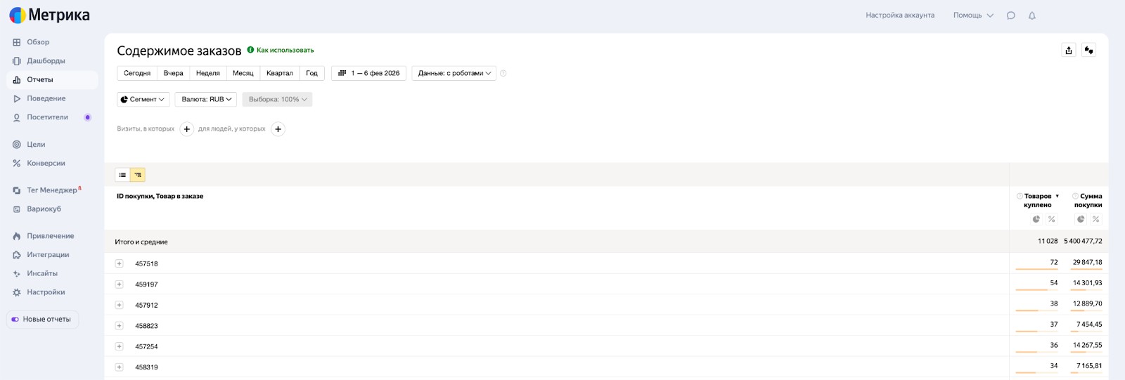 Где смотреть: ID заказов доступны в отчете «Электронная коммерция» → «Содержимое заказов». Данные из Метрики нужно выгрузить и сравнить с CRM клиента.