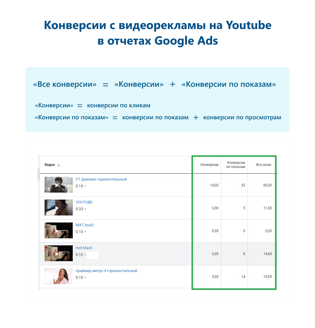 - В поисках конверсий с видеорекламы не нужно изучать под микроскопом статистику в Google Analytics. Смотрите отчеты Google Ads, только в них есть полная информация обо всех конверсиях: по кликам, по просмотрам и по показам.