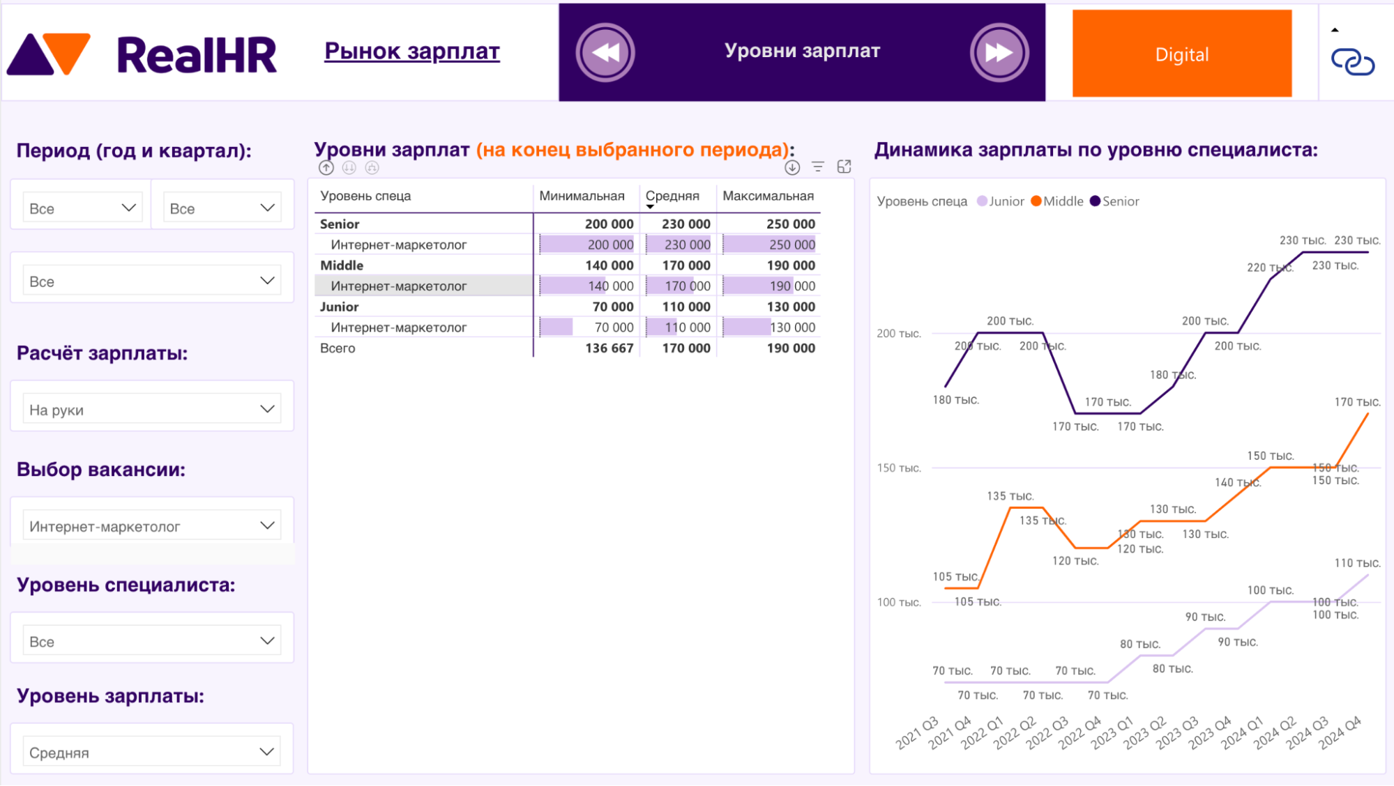 Уровень дохода маркетолога зависит от его опыта. Согласно данным RealHR, средняя зарплата маркетолога в Москве: