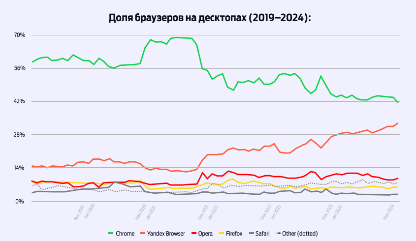 Лидером среди браузеров остается Chrome, но доля Яндекс Браузера продолжает расти.