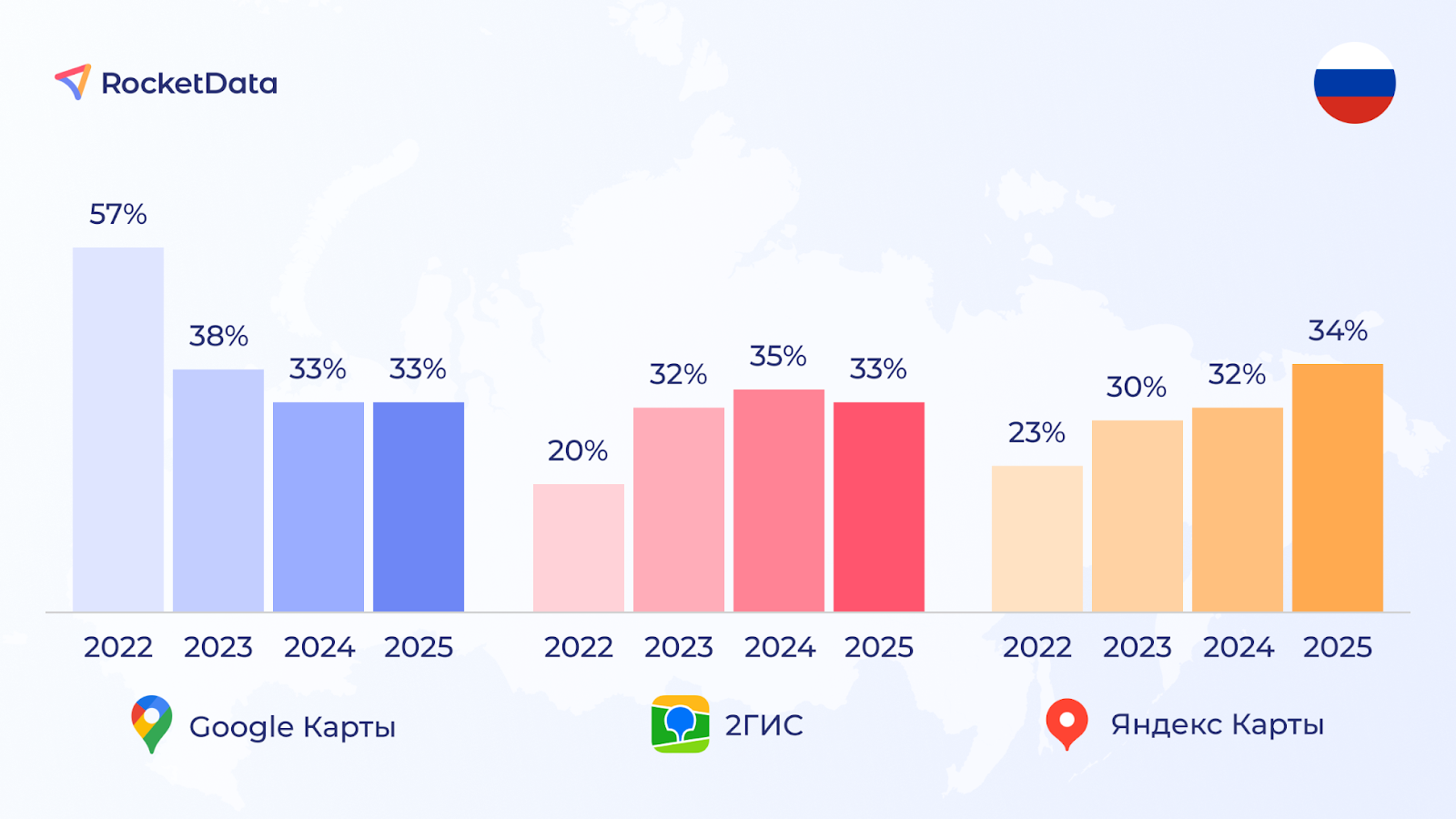 RocketData изучила пользователей геосервисов за последние три года. В результате аудиторию разделили примерно поровну три платформы: Яндекс, Google Карты и 2ГИС.