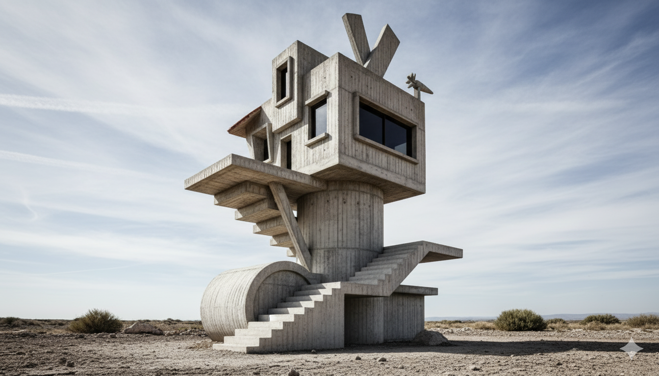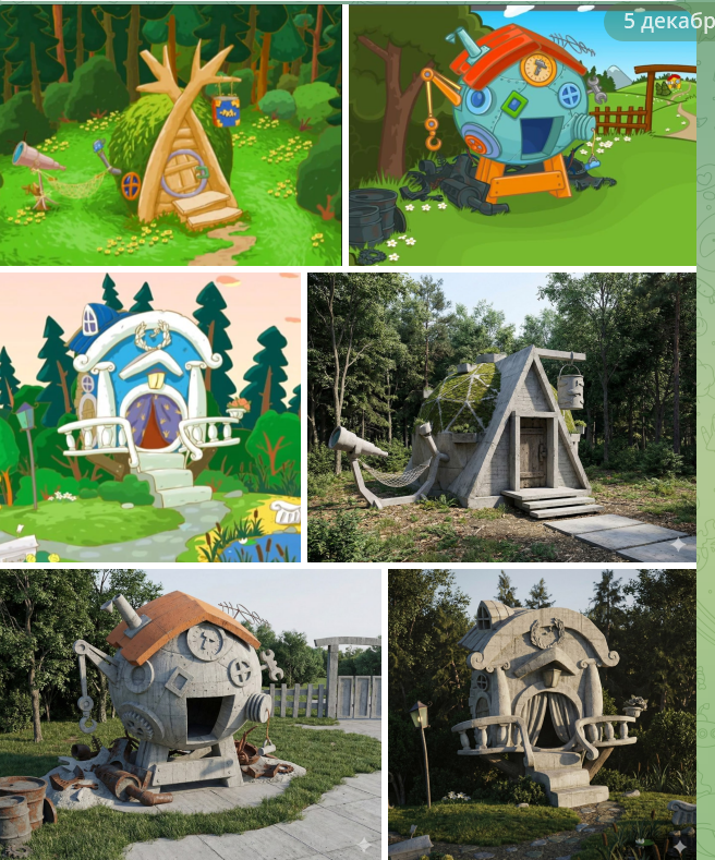 Вывод: нейросеть умеет сохранять форму и переосмысливать стиль, не ломая исходную идею. Например, дом Кроша стал монолитной бетонной структурой с огромным окном, но форма всё равно осталась узнаваемой.