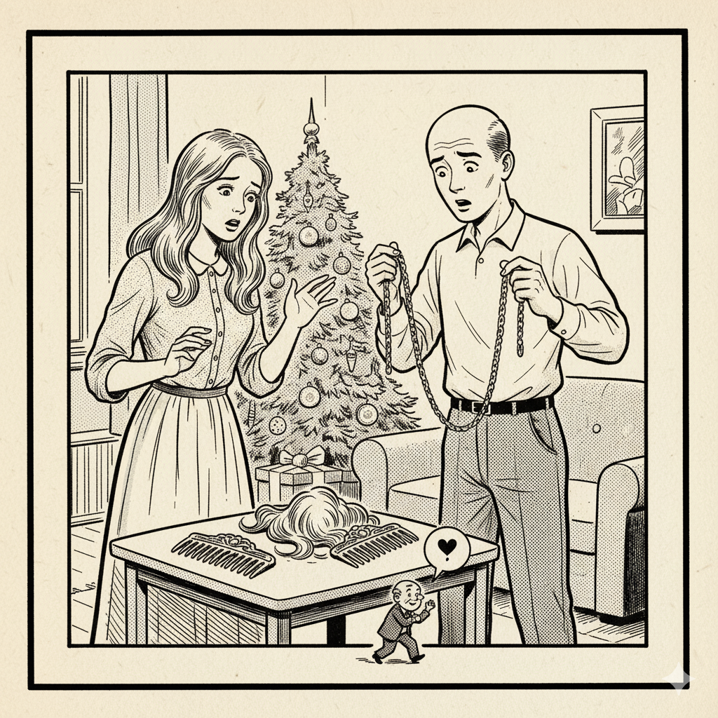 Произведение: рассказ О. Генри «Дары волхвов» — достаточно известный, чтобы без проблем изобразить его сюжет на одной картинке.