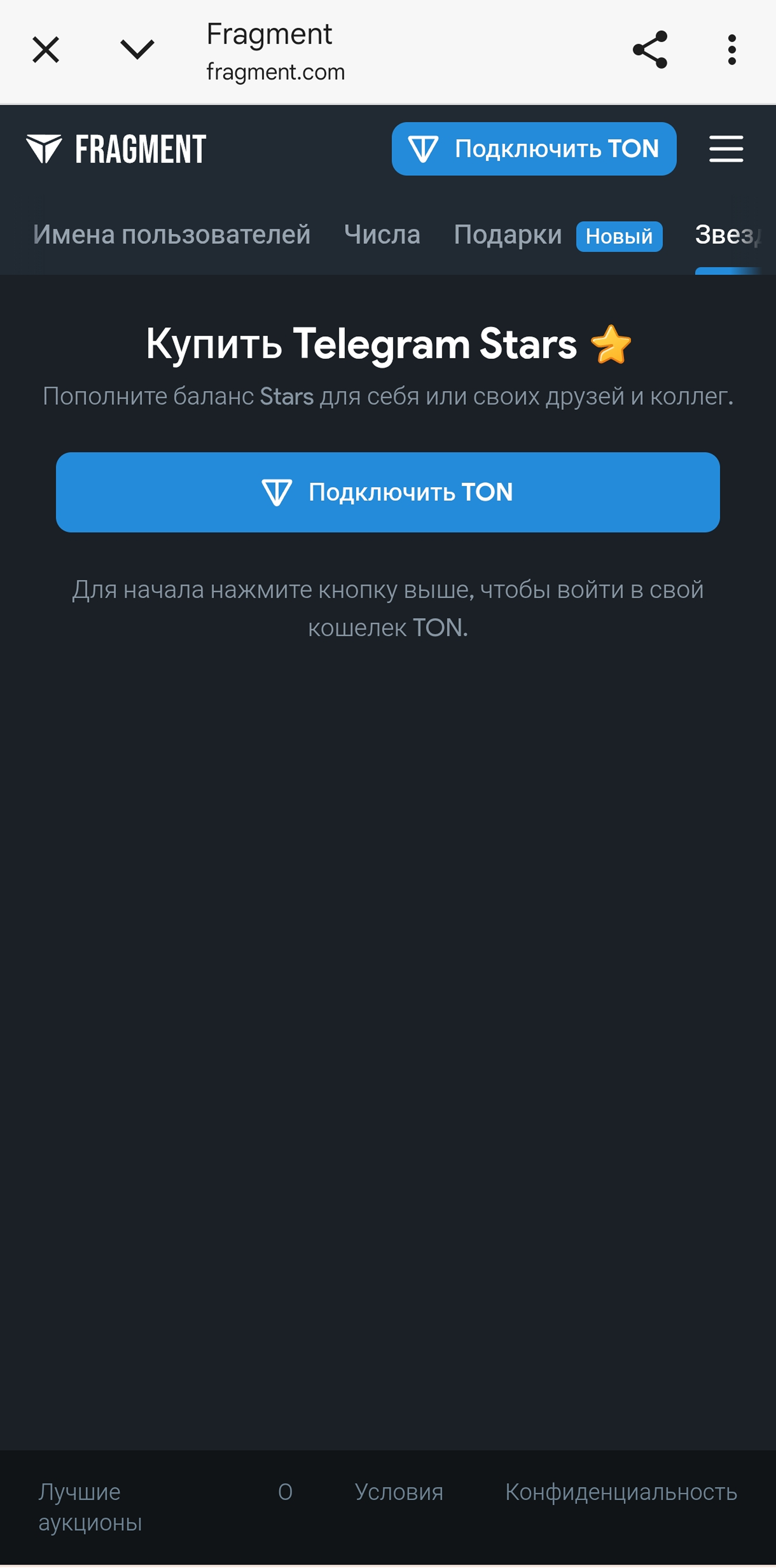 Через Fragment покупка возможна, но только для тех, у кого есть TON-кошелек (например, Telegram Wallet, Tonkeeper и пр). Нужно обменять валюту Toncoin на «Звезды», после покупки они зачислятся на ваш аккаунт.