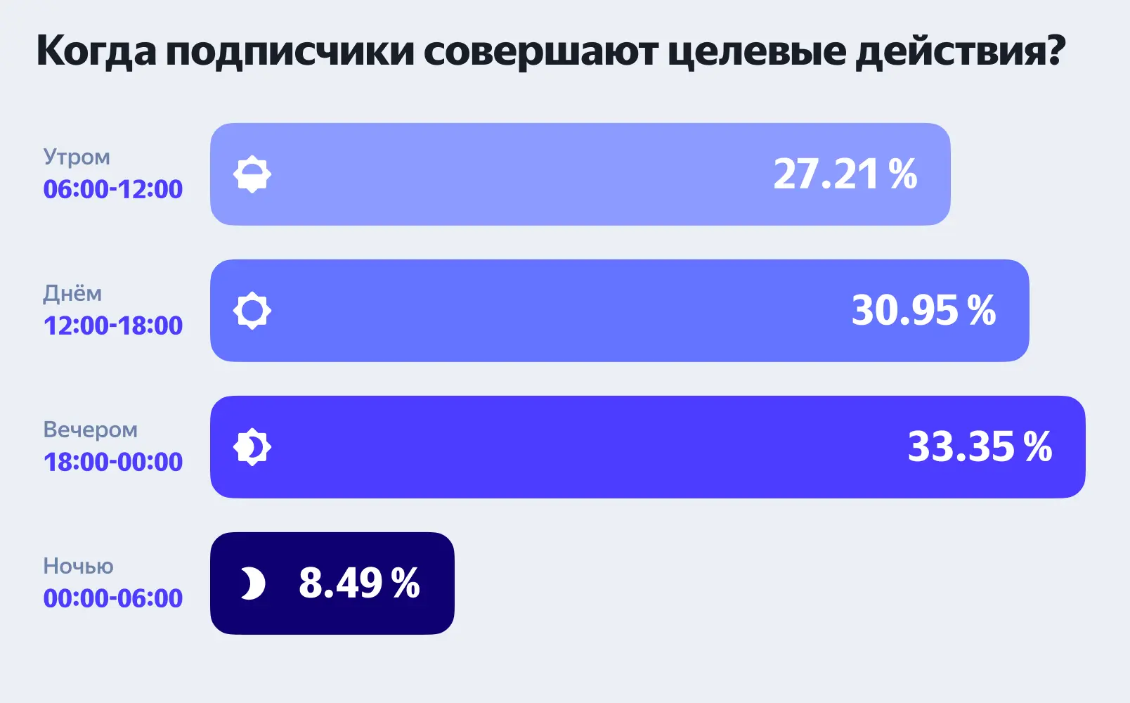 Чаще всего подписчики совершали целевые действия вечером после 18:00 и днем — с 12:00 до 18:00.