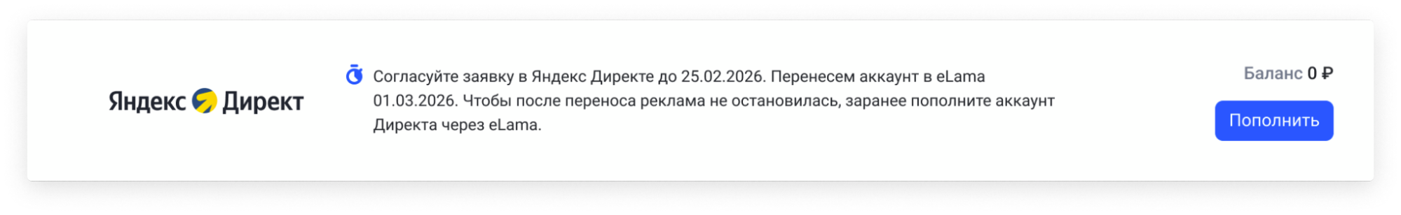 Пополнить общий баланс eLama до конца текущего месяца и перевести деньги в конкретный аккаунт Директа, чтобы кампания продолжила работать. В дальнейшем пополнять баланс Директа можно будет только через eLama.