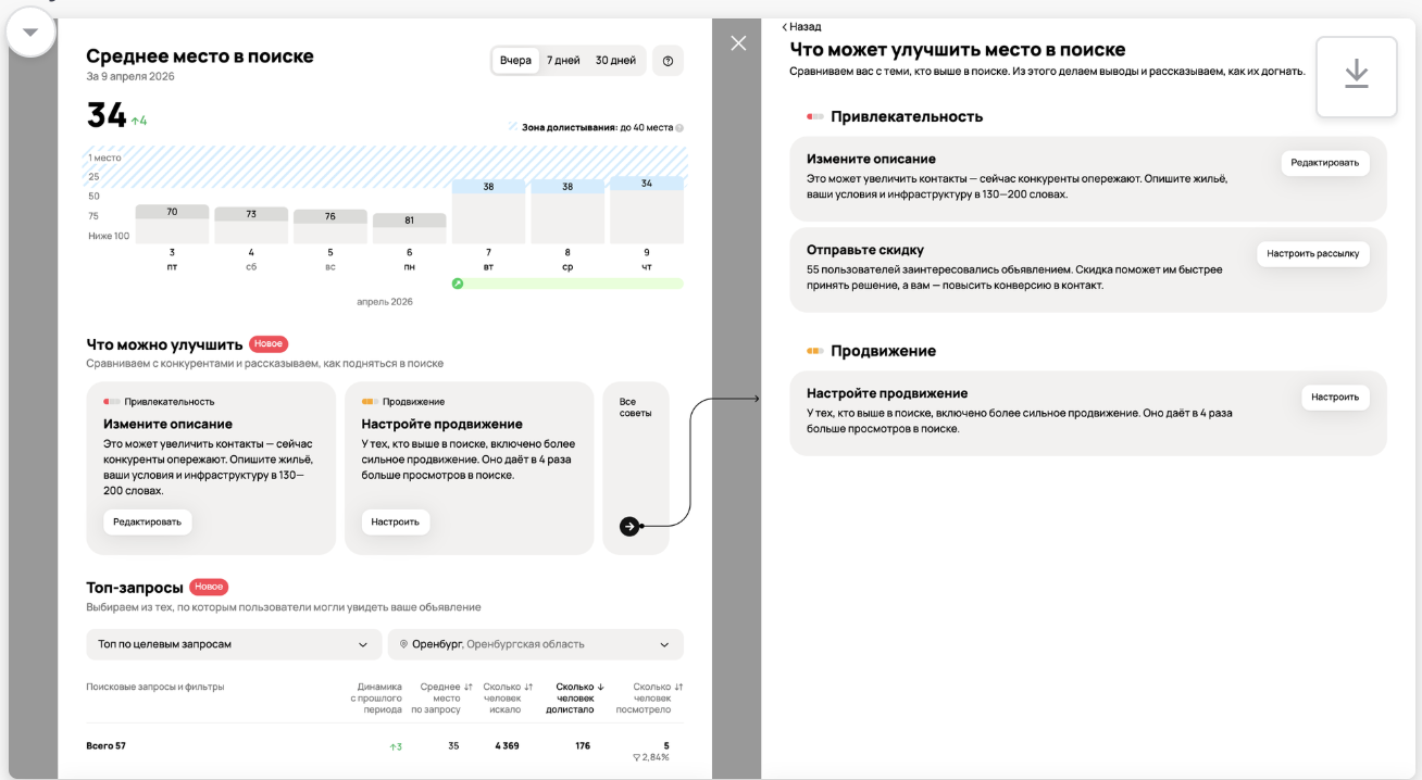 «Поиск является главной точкой контакта продавца и покупателя на Авито. Теперь продавец получает более полную картину о том, что влияет на позицию объявлений, и может принимать решения, которые реально влияют на рост показов и количества контактов», — отмечает руководитель продуктов аналитики для продавцов Авито Ольга Приходько.