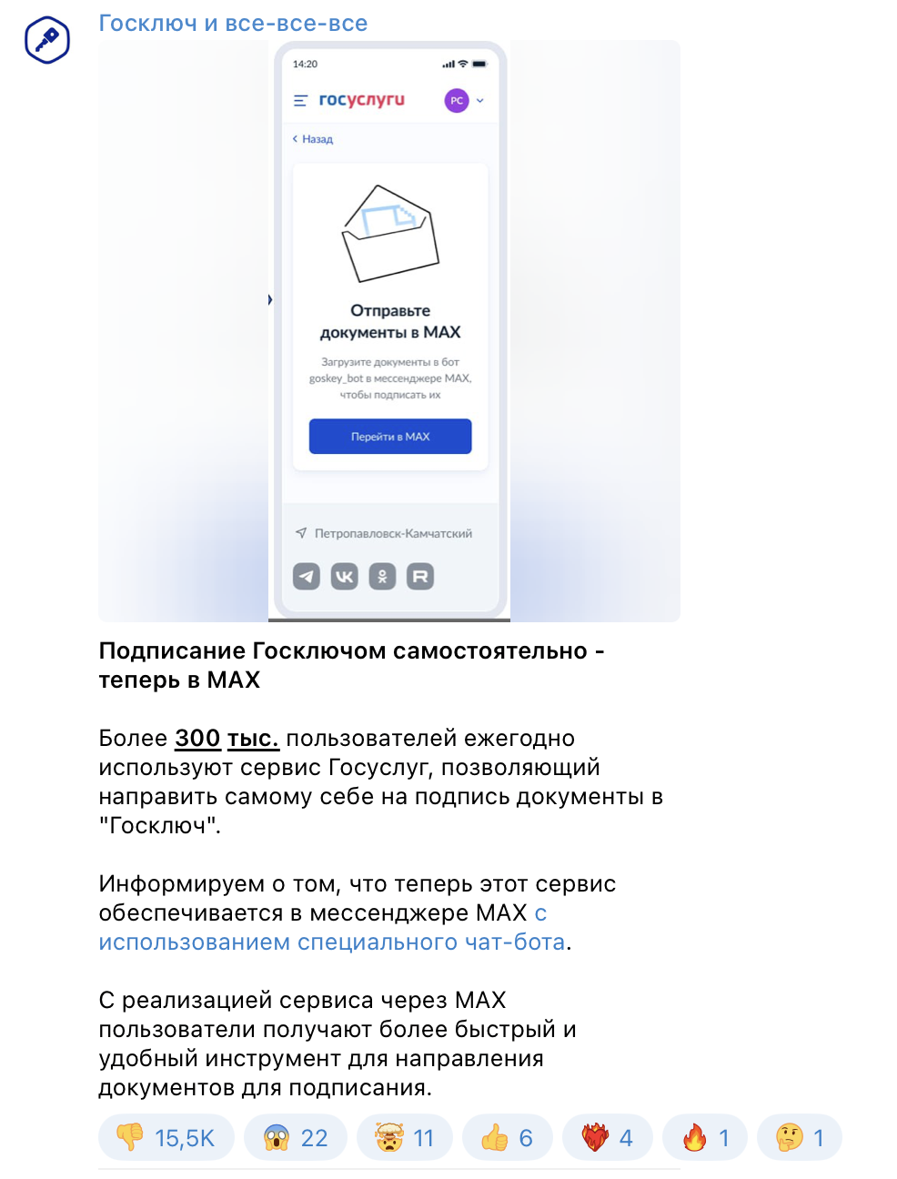 Напомним, что в октябре 2025 года в мессенджере Max появился сервис для подписания документов — встроенный чат-бот «Госключ».