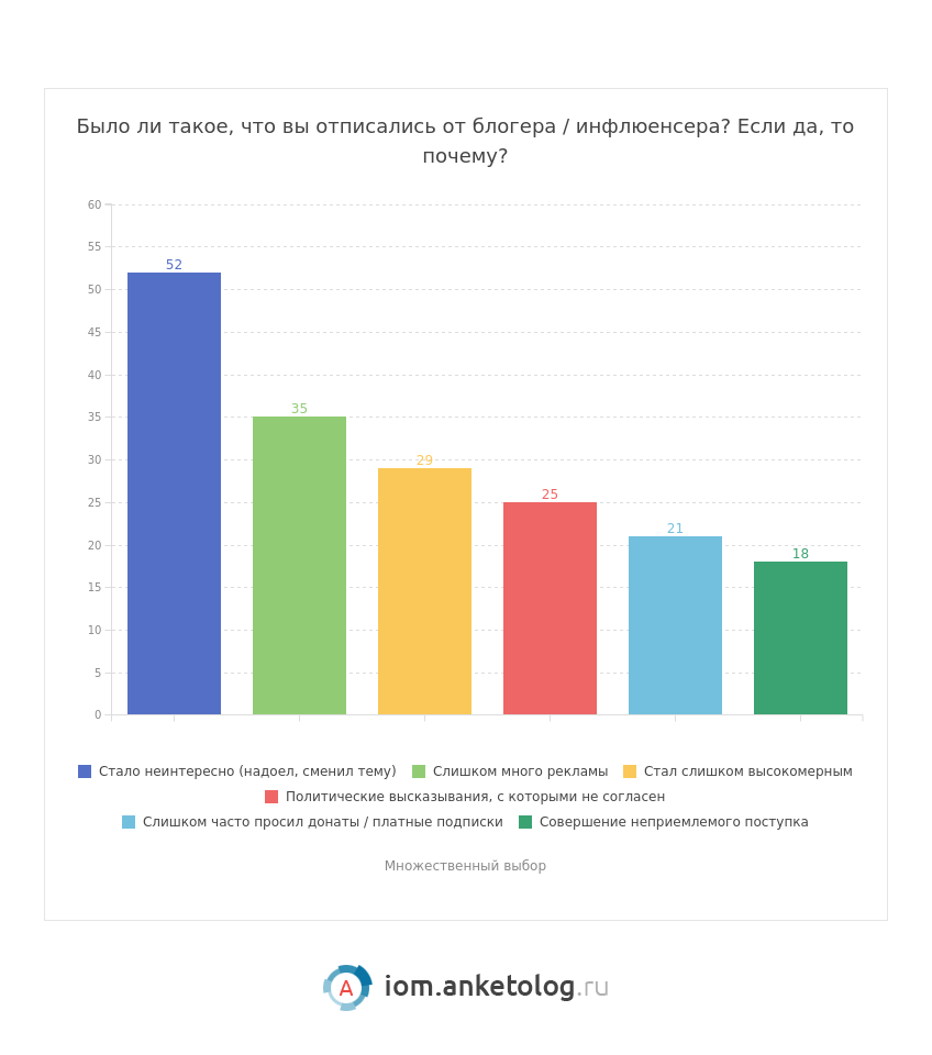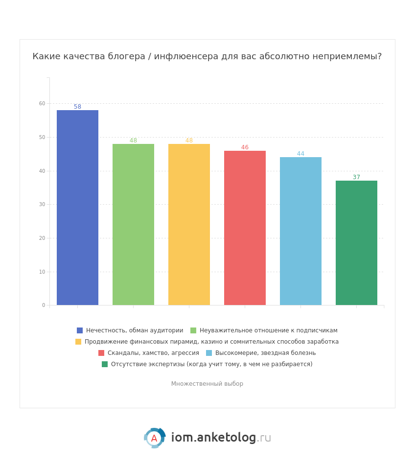 Аналитики сервиса онлайн-опросов «Анкетолог» изучили тренды потребления контента от инфлюенсеров и выяснили, каким россияне хотят видеть блогера. Среди главных критериев — искренность, честность, грамотность, интеллект, экспертность. При этом контент инфлюенсеров пользуется высоким спросом: 60% опрошенных смотрят его ежедневно, а каждый четвертый тратит на это от одного до двух часов, сообщается в исследовании «Анкетолог».