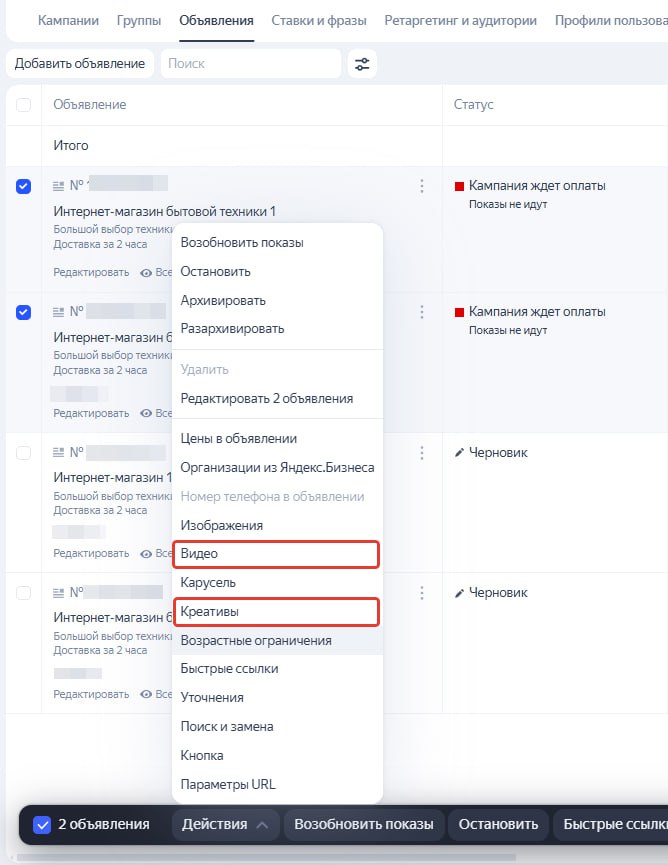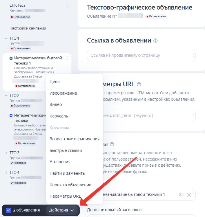 Массовые действия для объявлений стали доступны при редактировании кампании. Больше не нужно уходить со страницы редактирования кампании, чтобы добавить или поменять нужные элементы для всех объявлений.