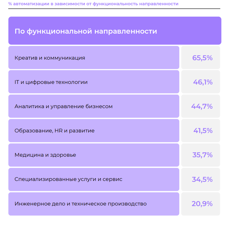 При этом в число отраслей с наибольшим процентом автоматизации с помощью ИИ вошли: