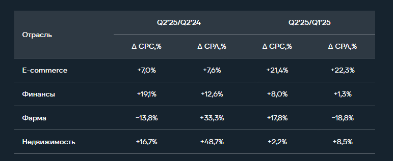 Согласно исследованию E-Promo Group, CPA в ecom за второй квартал 2025 года вырос на 22,3% а за год — на 7,6%. Таким образом ecom стал лидером по росту стоимости целевого действия в performance-рекламе.