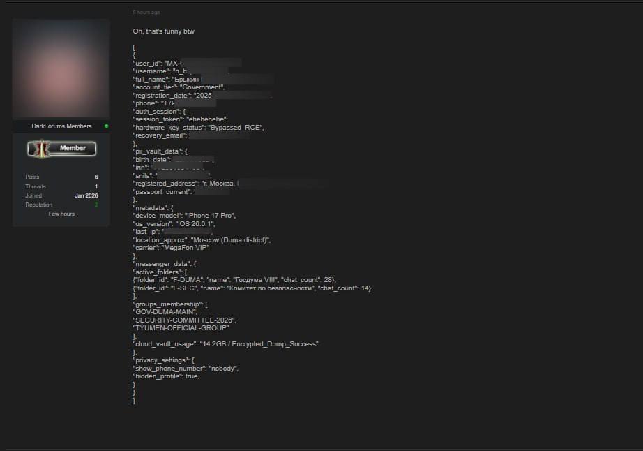 14 января 2026 года один из участников DarkForums заявил о компрометации данных более 15 млн пользователей Max. Информацию об этом распространили Telegram-каналы. Согласно сообщению, хакер получил доступ к следующим данным пользователей: