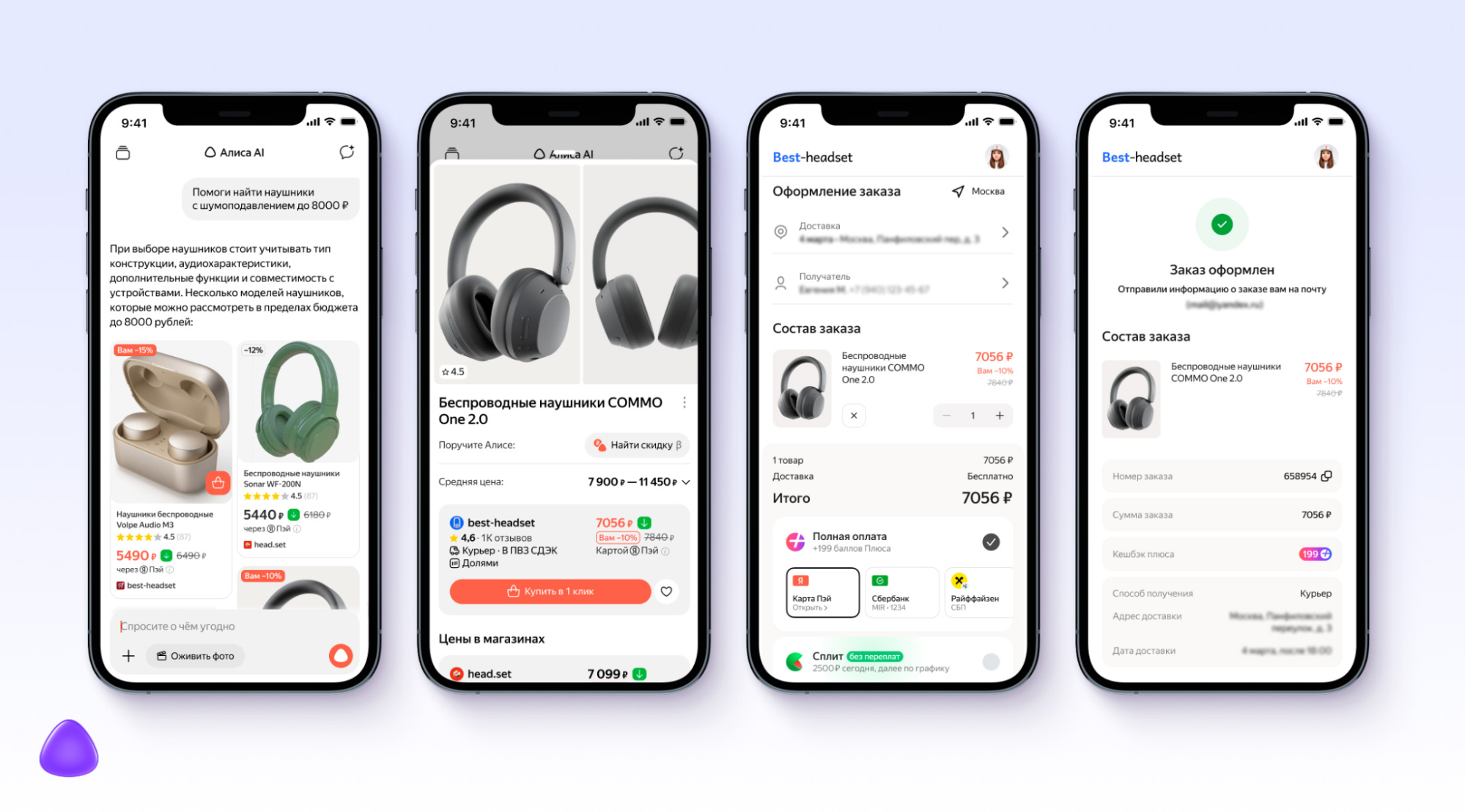 Клиент заказывает товар прямо в чате с Алисой или через поисковую выдачу Яндекса.