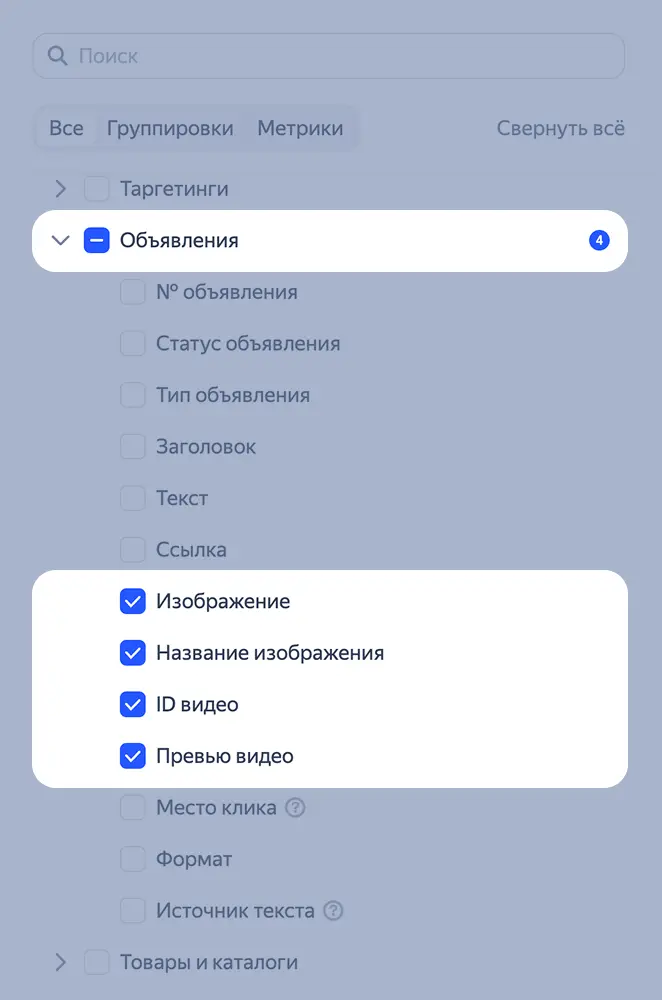 Они помогут оценить результаты показов как отдельных креативов, так и всех вариантов комбинаторных объявлений. Для этого рекомендуют их использовать вместе с группировками «Заголовок» и «Текст».
